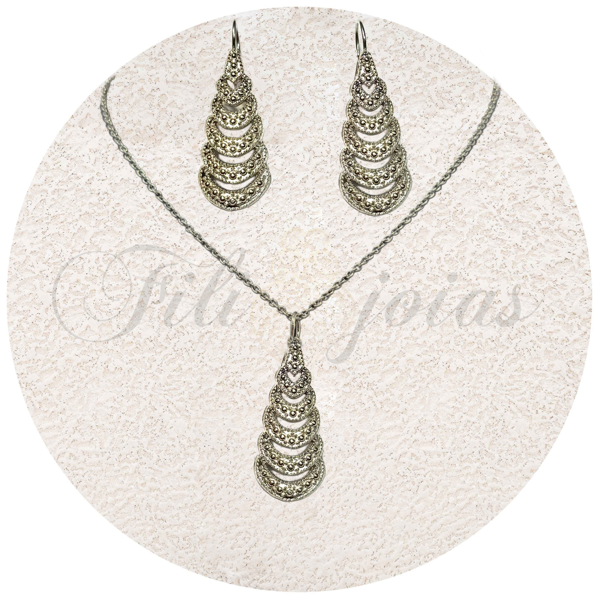 Conjunto inclui brincos, medalha e fio.