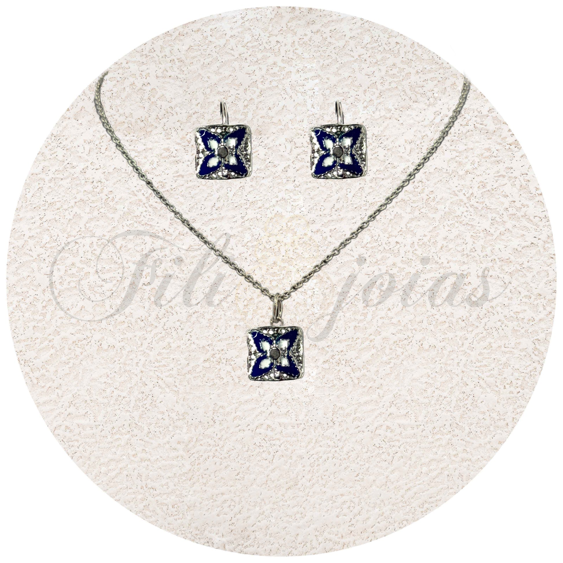 Conjunto inclui brincos, medalha e fio.